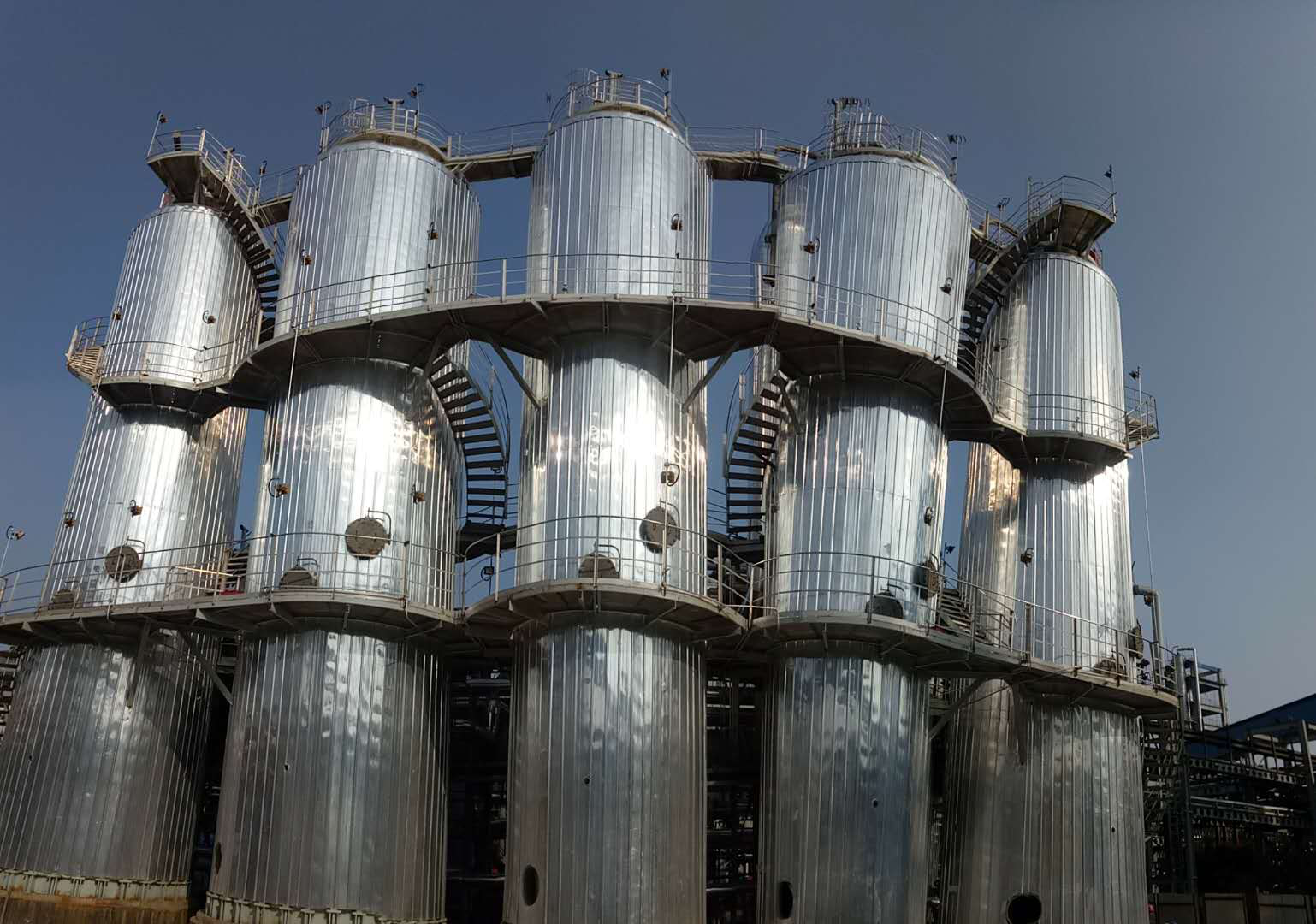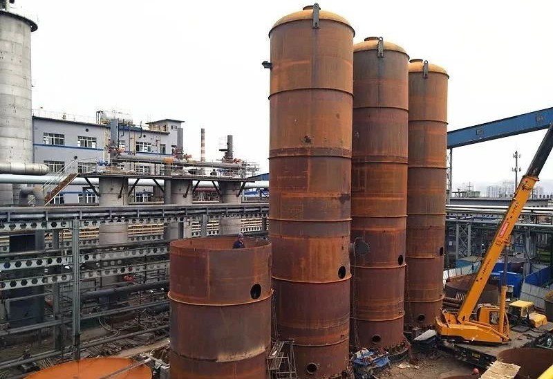 吸附塔建成后經除銹刷漆防腐并保溫,儼然數個穿戴整齊并肩矗立的鎧甲巨人。。。